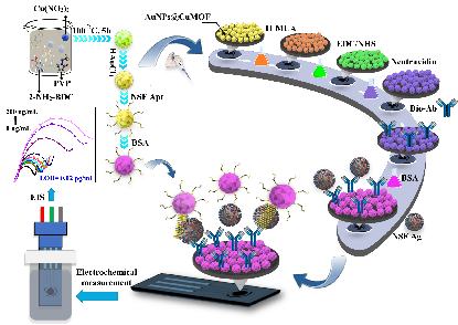图1: 所开发的基于AuNPs@CuMOF的NSE生物传感器的功能化过程与工作流程示意图。