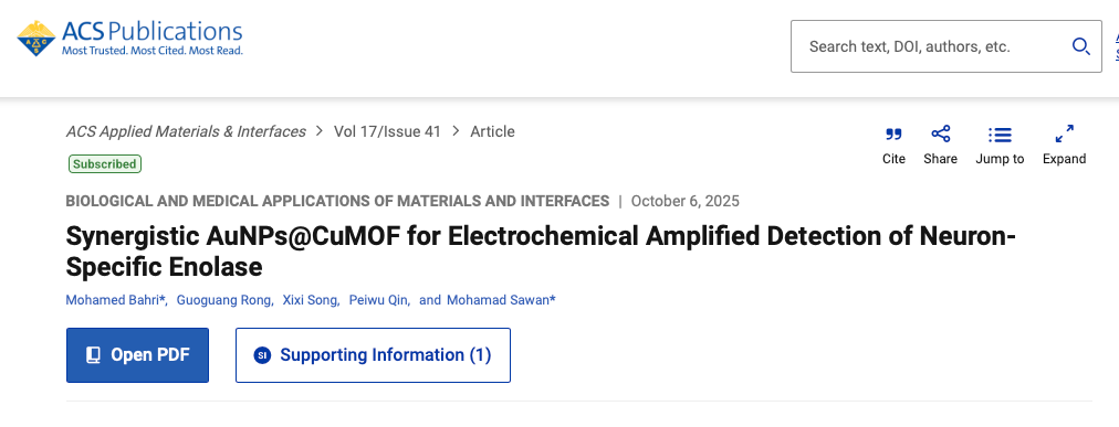 Bahri M, Rong G, Song X, Qin P, Sawan M. Synergistic AuNPs@CuMOF for Electrochemical Amplified Detection of Neuron-Specific Enolase. ACS Appl Mater Interfaces. 2025 Oct 15;17(41):56890-56901.