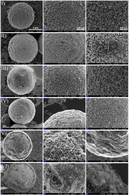 Figure 2: FESEM imaging attempts depict the morphological changes of AuNPs@CuMOF (I) and after each functionalization step: 11-MUA modification (II), EDC/NHS activation (III), NeutrAvidin immobilization (IV), biotinylated antibody attachment (V), and BSA blocking (VI).