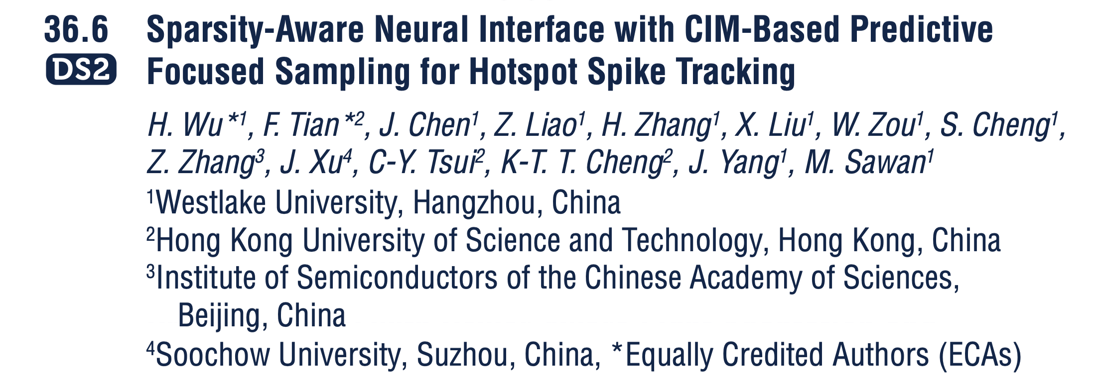 Our paper titled “Sparsity-Aware Neural Interface with CIM-Based Predictive Focused Sampling for Hotspot Spike Tracking” has been accepted for publication in the 2026 IEEE International Solid-State Circuits Conference (IEEE ISSCC’26), which is the premier global conference in integrated circuit design.