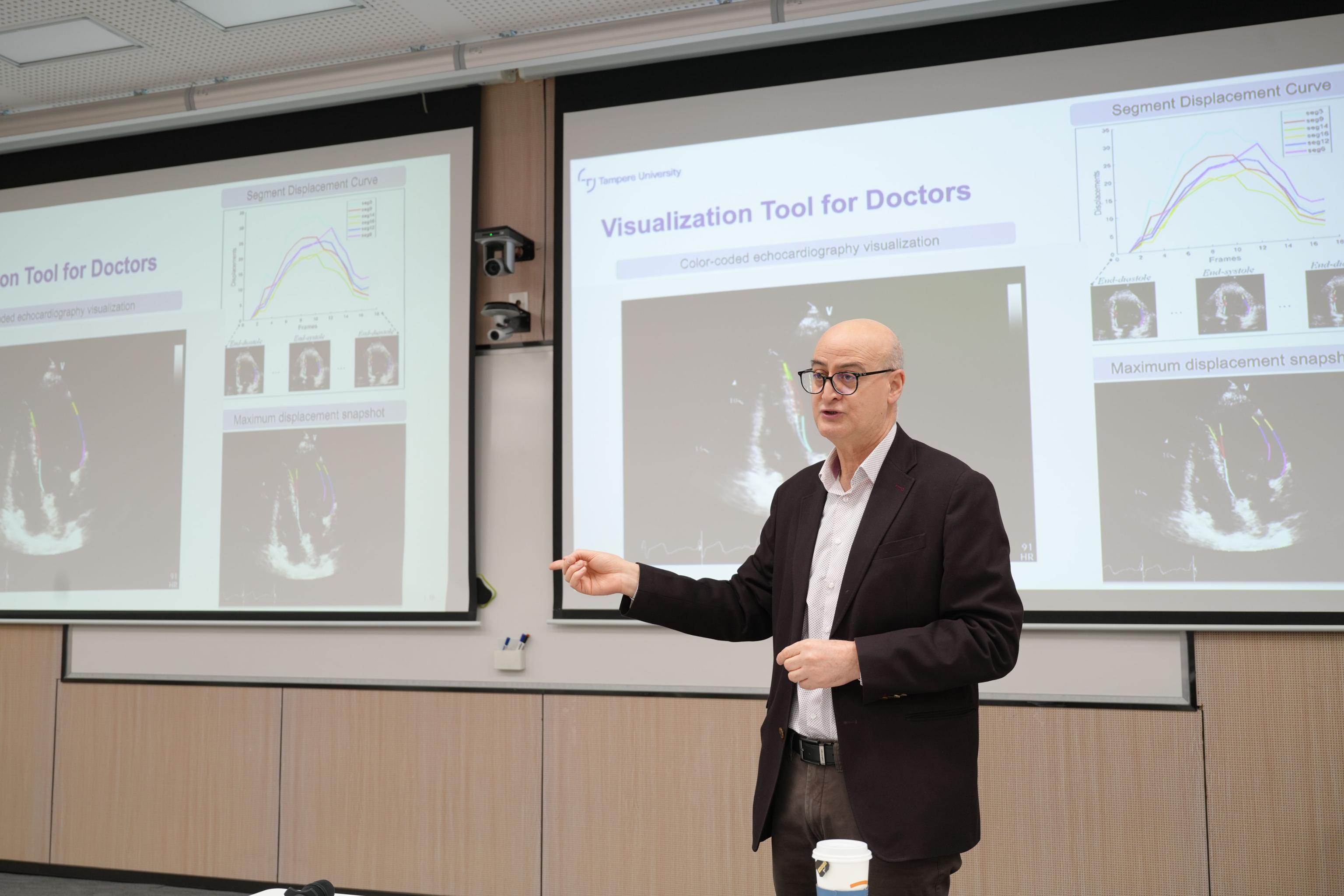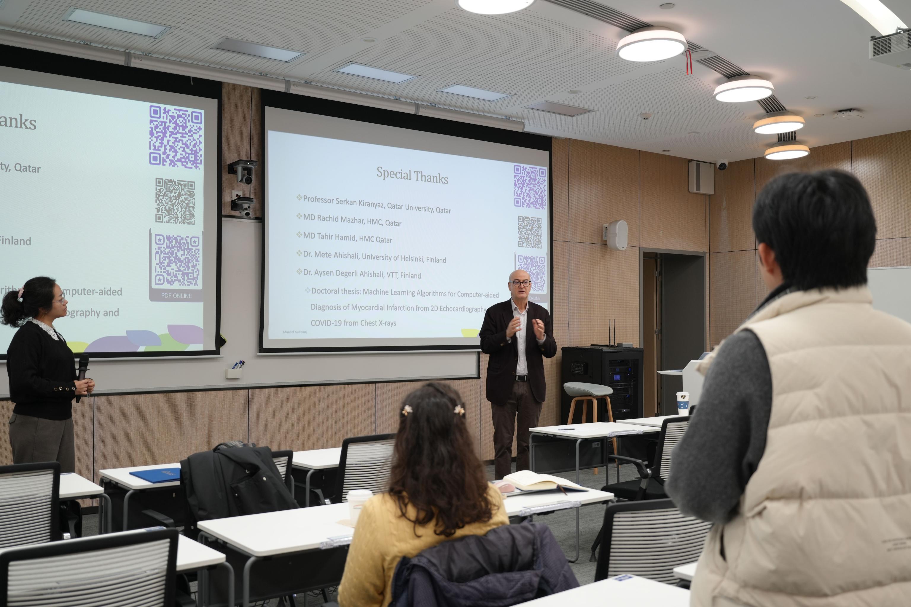 The lecture focused on the latest machine learning algorithms developed by his team for the detection and assessment of myocardial infarction (MI) using apical 4-chamber (A4C) and apical 2-chamber (A2C) view 2D echocardiography recordings. Myocardial infarction, the most severe manifestation of coronary artery disease, can lead to irreversible myocardial necrosis and even death. Its detection crucially relies on the assessment of regional wall motion abnormalities of the left ventricle (LV), for which 2D echocardiography serves as a primary tool.