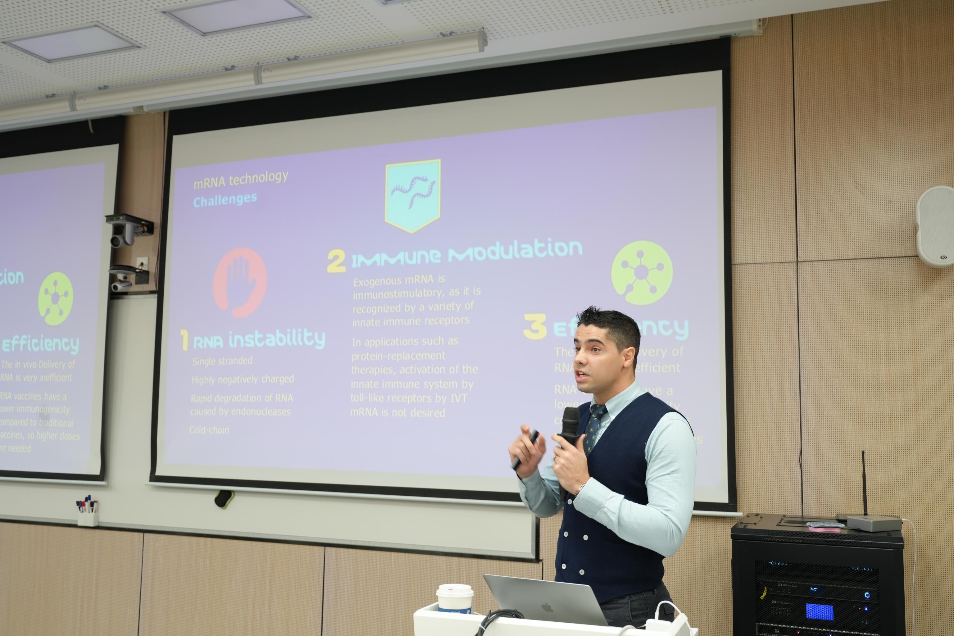 In his lecture, Professor Imani systematically introduced the core mechanism of neoantigen-based mRNA cancer vaccines: specific neoantigens produced by cancer cells due to genetic mutations act as “keys” to activate the immune system. His team analyzes individualized cancer characteristics of patients to screen for the most effective neoantigens, which are then encoded into mRNA vaccines to precisely target and eliminate cancer cells, offering a breakthrough in personalized cancer treatment.