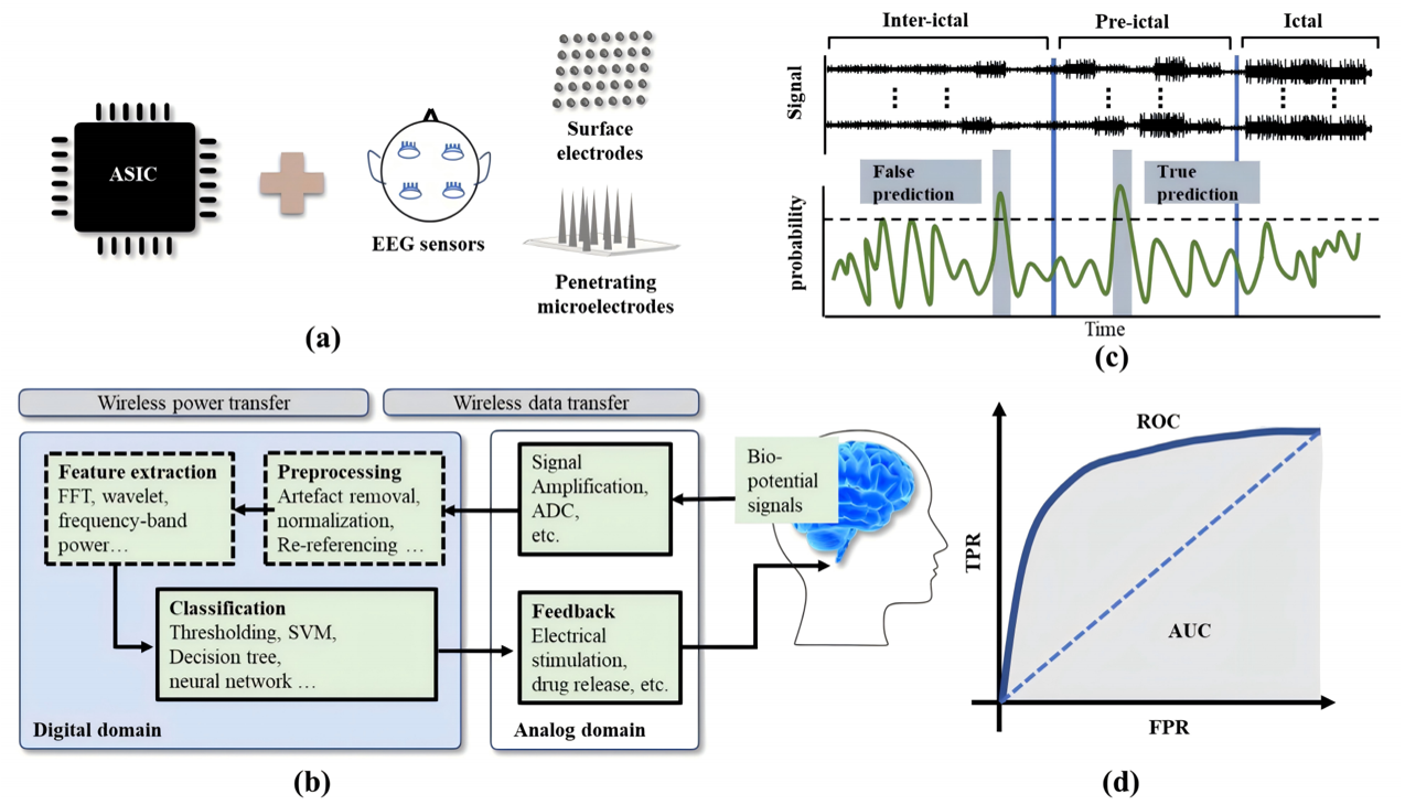 Figure 1. Basic concepts of seizure prediction systems: (a) Highly integrated seizure prediction system including a bio-interface or micro-electrode array to collect bio-signals such as EEG, ECoG, and an integrated circuit for analog and digital processing. (b) Key digital and analog hardware blocks to building a closed-loop neuromodulation (CLNM) system. (c) The goal of the system is to classify different seizure stages based on the captured bio-signals. (d) Performance of the system is characterized by various metrics such as receiver operating characteristic curve (ROC), area under curve (AUC), which are determined by true positive rate (TPR) and false positive rate (FPR) of the system.